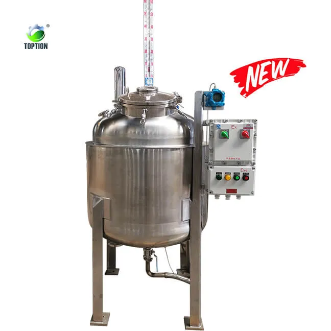 Резервоар за складиштење од нерђајућег челика ТОПТИОН подржава професионално прилагођавање, двослојно, једнослојно и прилагођавање широког капацитета. За претходно замрзавање алкохола пре центрифугалне екстракције етанола, одаберите двослојни, одговарајући фрижидер да бисте постигли ефекат предсмрзавања. За складиштење течности након филтрације бира се једнослојни резервоар за складиштење, који се углавном користи за пуферирање пре уласка у испаривач како би се постигла сврха стабилног и непрекидног напајања.